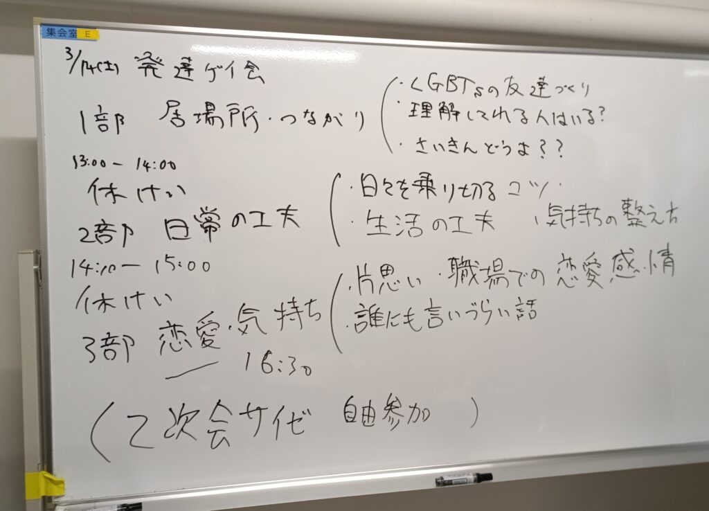 今回のテーマ:居場所・日常の工夫・恋愛感情について 今回の発達ゲイ会も、いつものように3部構成で行いました。1部では近況や居場所の話、2部では日々を乗り切る工夫…